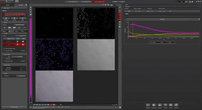通過像素分類器,用戶能夠標(biāo)記其感興趣區(qū)域(ROI),該區(qū)域?qū)⒆鳛樗幸獧z測的其他區(qū)域的示例。如圖5所示,細(xì)胞核被像素分類器標(biāo)記并檢測。像素分類器同樣能夠標(biāo)記并檢測線粒體活性標(biāo)識TMRE和caspase呈陽性的細(xì)胞。之后會在整個延時攝影過程中分析這批圖像。