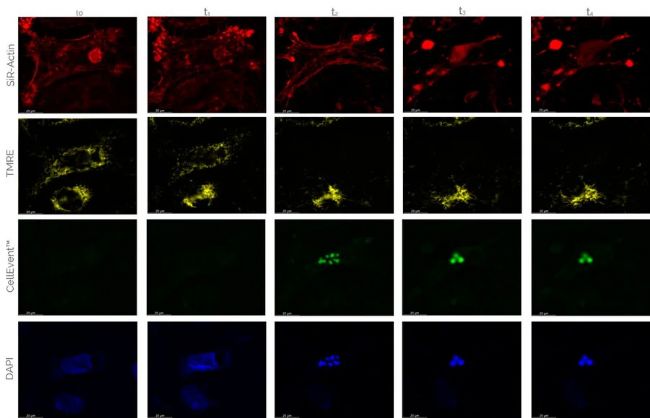 用戶可以通過MICA一次性對四種熒光成像。在caspase 3/7活性檢測法中,這有助于調(diào)查凋亡過程中額外的細(xì)胞成分的命運(yùn)—實現(xiàn)100%時空相關(guān)性。圖5中展示的案例顯示,除了細(xì)胞核(DAPI)、激活狀態(tài)的線粒體(TMRE)以及caspase陽性細(xì)胞(CellEvent™)以外,也對肌動蛋白細(xì)胞骨架(SiR-Actin)進(jìn)行了染色。