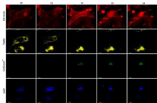 U2OS細胞在加入細胞凋亡誘導劑星形孢菌素后,在13小時延時成像過程中拍攝標記了SiR Actin、TMRE、CellEvent™和DAPI的圖像。