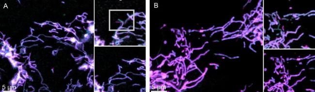 圖3:MICA的63x/1.2 W PL Apo CS2 SmartCORR物鏡在寬場模式下拍攝的用MitoTracker™綠色(青色)和四甲基羅丹明乙酯(TMRE,品紅)染色的U2OS細胞圖像。A) 序列采集MitoTracker™綠色通道和TMRE通道,其中裁剪圖像顯示由于序列采集兩個通道之間出現了時空偏移。B)同時采集MitoTracker™綠色通道和TMRE通道,裁剪的圖像顯示兩個通道之間沒有任何時空偏移。兩個通道保持共定位,并能夠對每個MitoTracker™綠色結構(線粒體結構)中的TMRE信號(線粒體膜電位)進行量化測量。比例尺為5µm。