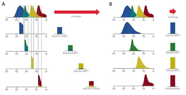 圖4:A) 傳統寬場4色熒光成像使用帶通熒光發射濾波器:結果是染料分離度差,導致定位精度低,切斷信號式減少串擾,序列成像慢。B) 帶FluoSync技術的MICA可以同時進行4個標簽的成像,寬光譜檢測和拆分[9]進行真正的染料分離,以及4倍的同時成像速度。