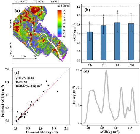 不同鹽沼群落AGB的空間分布、驗證和比較。(a)利用UAV-LiDAR數據和隨機森林模型進行鹽沼植被AGB制圖。(b)不同鹽沼群落AGB平均值。(c)AGB實測值和預測值的回歸擬合。(d)AGB預測值的密度分布曲線。