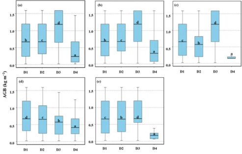 與潮溝不同距離的鹽沼AGB的比較。(a)代表整個植被群落AGB變化趨勢;(b-e)分別代表PA,IC,CS和SM的AGB變化趨勢。D1:0-50 m;D2:50-100 m;D3:100-150 m;D4:150-200 m。