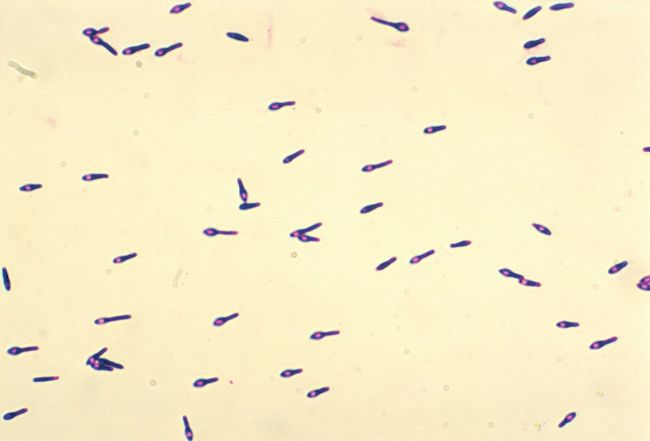 這是肉毒桿菌,總體呈紫色,革蘭氏陽性菌,其次極端有陰性反應的芽孢,呈紅色,總體形狀看起來像個湯匙,會產生劇毒的肉毒毒素。