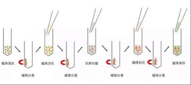 磁微粒式化學發光檢測靈敏度極高,需要極高的穩定性和批間一致性。不但對原料質量要求極高,對研發生產工藝的控制也極其重要,其中磁珠與蛋白的偶聯工藝過程對試劑性能也非常關鍵。不同表面官能團的磁珠,偶聯工藝會有所區別,但具有一個共同的特點,偶聯過程中都需要進行磁分離清洗過程。比如典型的EDC/NHS二步法偶聯羧基磁珠,過程包括磁珠應用前清洗、活化、偶聯、封閉和清洗等過程,至少包含了四次清洗。清洗過程中如何確保磁珠的分離效率和磁珠的回收率是極為重要的,因為這二者是分離過程中的關鍵參數。