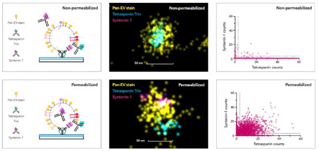 EV Profiler V2試劑盒包含用于捕獲、固定和染色外泌體所有必要的試劑。然后借助Nanomimager獲得單分子定位數(shù)據(jù)和納米級(jí)分辨率圖像,通過(guò)CODI平臺(tái)對(duì)這些數(shù)據(jù)進(jìn)行分析,在幾個(gè)小時(shí)就可以得到對(duì)單個(gè)外泌體成像的結(jié)果。該工作流程適用于低至10µL的外泌體樣本量。