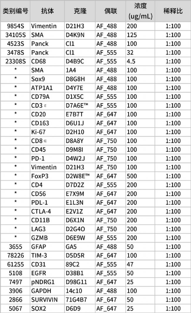 表征腫瘤微環(huán)境有助于理解導(dǎo)致患者預(yù)后不佳的新機(jī)制。腫瘤微環(huán)境比較復(fù)雜,通常在單個(gè)樣本和不同患者樣本中都是異質(zhì)的。循環(huán)多標(biāo)記染色和成像可在不同組織樣本中實(shí)現(xiàn)TME探查,即使可用組織有限的情況下。在這項(xiàng)研究中,我們檢查了12個(gè)完整組織或TMA切片中30多個(gè)生物標(biāo)志物的表達(dá)(表1),重點(diǎn)是潛在的免疫治療目標(biāo)、預(yù)測性生物標(biāo)志物和分割標(biāo)志物。所有的CST生物標(biāo)志物抗體均被連接并隨機(jī)分配到一個(gè)回合。
