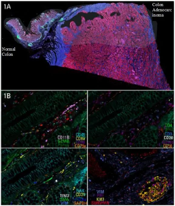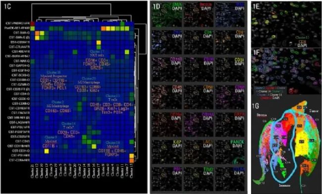 圖2:CST檢測模式在多種癌癥和正常組織類型中的多標(biāo)成像。玻片被反復(fù)染色和成像(表1;圖2組織類型)。所有生物標(biāo)志物顯示在一張圖像中。使用全套30種生物標(biāo)志物進(jìn)行分割后,聚類分析顯示了組織內(nèi)的免疫細(xì)胞(數(shù)據(jù)未顯示)。組織特定的免疫細(xì)胞聚類是由特定的生物標(biāo)志物表達(dá)模式統(tǒng)計(jì)出來的。在聚類之后,單細(xì)胞表型能夠?qū)垲愔械募?xì)胞群進(jìn)行空間分析。