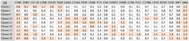 在這項(xiàng)研究中,我們展示了人類結(jié)腸腺癌(CAC;圖1)的聚類分析。在這里,聚類分析將白細(xì)胞從所有其他上皮細(xì)胞和基質(zhì)細(xì)胞類型中區(qū)分出來(圖1C)。此外,聚類清楚地定義了淋巴細(xì)胞和骨髓細(xì)胞類別。CAC中的骨髓類亞型包括骨髓祖細(xì)胞、M2巨噬細(xì)胞和另外兩個(gè)未知亞型的骨髓聚類。其他生物標(biāo)志物可用于進(jìn)一步定義亞型。對于淋巴類,定義了T細(xì)胞和NKT細(xì)胞聚類。另外,還確定了一個(gè)具有CD20陽性的T細(xì)胞聚類。使用機(jī)器學(xué)習(xí)進(jìn)行單細(xì)胞表型分析,可以從聚類中進(jìn)一步定義細(xì)胞類型。例如,在圖像1D中,聚類15中的一個(gè)細(xì)胞是CD45+ CD3+ CD8+ CD4+ GRZB+ Ki67+ LAG3+ PD1+TIM3+(圖1D-E;橙色圈)。聚類和單細(xì)胞空間分析被應(yīng)用于研究中的所有其他組織(圖2;數(shù)據(jù)未顯示)。