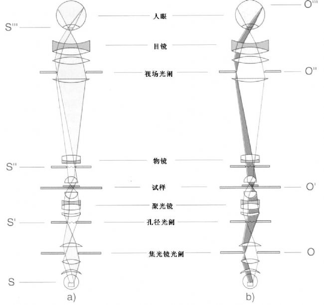 經過集光鏡和聚光鏡系統把光源成像到試樣上。
