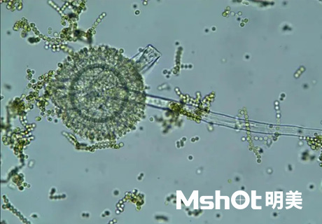 黃曲霉是一種常見腐生真菌,多見于發霉的糧食、糧制品及其它霉腐的有機物上。菌落生長較快,結構疏松,菌體有許多復雜的分枝菌絲構成。顯微鏡鏡檢下,營養菌絲具有分隔;氣生菌絲的一部分形成長而粗糙的分生孢子梗,頂端產生燒瓶形或近球形頂囊,表面產生許多小梗(一般為雙層),小梗上著生成串的表面粗糙的球形分生孢子。下面讓小編帶大家看看不同顯微鏡下的黃曲霉。