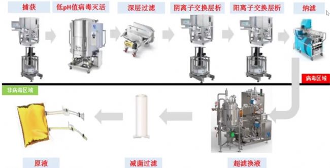 抗體藥物原液中試制備領(lǐng)域(可滿(mǎn)足IND報(bào)批及臨床試驗(yàn)用樣品量級(jí)制備),抗體原液的生產(chǎn)通常分為ProteinA親和捕獲、病毒滅活、深層過(guò)濾、陰離子交換、陽(yáng)離子交換、納濾、超濾換液、除菌過(guò)濾、分裝存儲(chǔ)等環(huán)節(jié)。此時(shí)在捕獲及陰離子交換、陽(yáng)離子交換層析步驟需要使用中試級(jí)別層析儀。