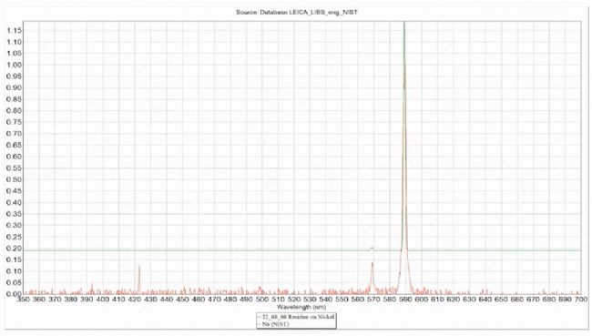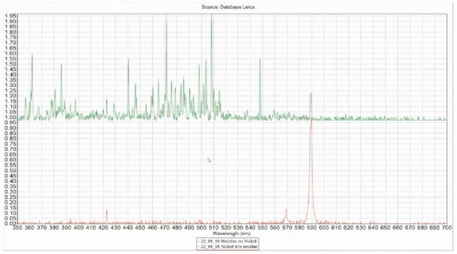 現在我們開始準備進行光學檢測。對比數據庫中的光譜,大家可以看到來自殘留物的光譜和來自鎳區的光譜它們是完全不同的,這個很明顯。但現在的問題是,它是什么?因此,需要改變數據庫,比較檢測出的光譜和數據庫中的光譜,根據數據庫的信息顯示這主要是鈉。如果大家現在比較這兩個光譜,可以看到這主要是鈉,與鎳基的程序相同。如果你把這兩個放在一起,你會看到,或多或少你從基礎材料中得到的所有峰值,你也會在理論上的鎳或鎳的光譜中找到。因此,很明顯,除了鎳本身,鎳上沒有太多的其他東西,上圖則是比較得出的結果。