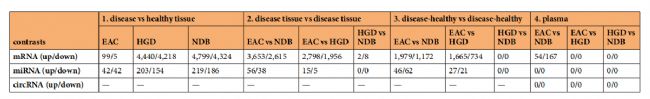對組織和血漿中的mRNA、miRNA和環狀RNA進行了同源基因表達和豐度分析。不同表達基因的數量見表1。預處理后的數據也被上傳到R2 Genomics Analysis and Visualization Platform 中(http://r2.amc.nl),可對數據集的進一步探索和可視化。在本研究中,我們在EAC、HGD和NDB患者的血漿中鑒定了幾種環狀RNA,它們的環狀結構更能抵抗外切酶的RNA降解,因此這種類型的RNA作為循環生物標記物具有很大的潛力。雖然我們關注使用小RNA測序數據進行miRNA表達和豐度分析,但其他小RNA如tRNA(片段)和piRNA也可以使用我們的數據進行分析。