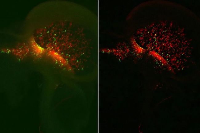 圖1:mScarlet RFP和音猬因子調控的EGFP標記的神經祖細胞雞胚腦圖像:A) Computational clearing處理前的原始寬場EDoF結果;B)SVCC處理后的結果。圖片來源:Timothy Sanders醫學博士兼哲學博士,美國芝加哥大學格羅斯曼神經科學、定量生物學和人類行為研究所。