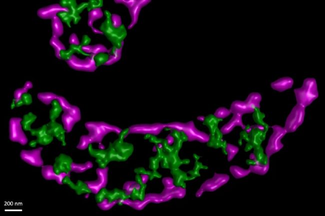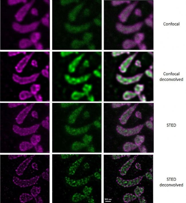 圖1:圖片顯示了人類線粒體網絡截面,以共聚焦顯微鏡和STED顯納鏡的分辨率拍攝,用775nmSTED激光器損耗AF594,用660nmSTED激光器損耗AF532。這些圖片是顯示新合成蛋白質的亞線粒體位置的關鍵圖像。綠色的熒光信號代表新合成的線粒體蛋白,品紅色是線粒體內界膜中發現的線粒體蛋白(TIM23)的免疫熒光抗體。