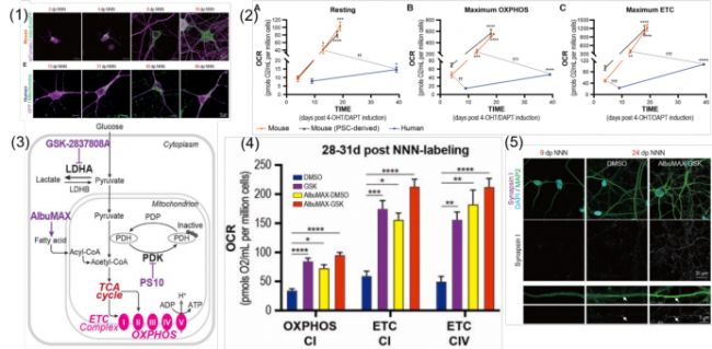 (4、5)作者再次通過奧地利Oroboros O2k檢測了GSK和AlbuMAX不同組合實驗方案刺激神經元后的線粒體代謝活性;發現增加線粒體OCR,尤其是氧化磷酸化(OXPHOS)和電子傳遞鏈(ETC)中復合體I(CI)和復合體IV(CIV)能力,加速人類神經元的形態分化。