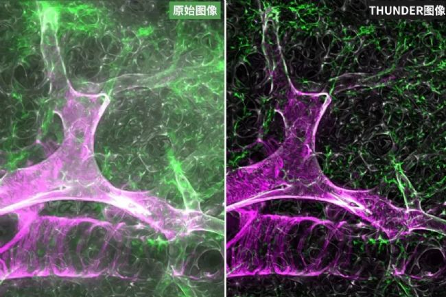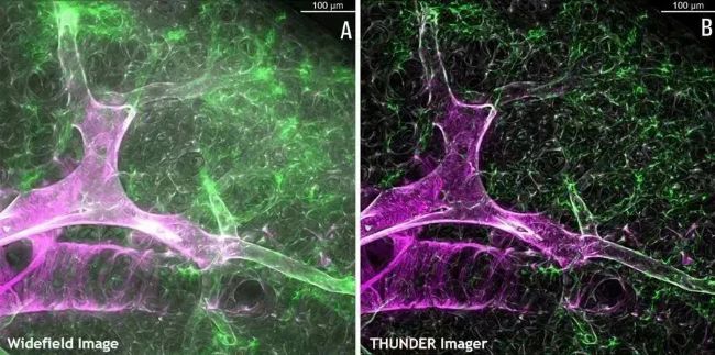 小鼠肺組織圖像:(左)原始寬場圖像和(右)使用Instant Computational Clearing(ICC)技術后的THUNDER高清圖像。圖片來源:美國加利福尼亞州Ross Metzger博士。