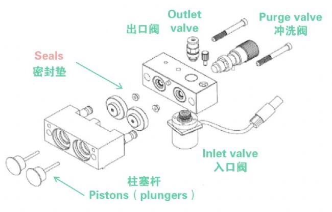下圖以常用的Agilent液相色譜系統(tǒng)泵模塊示意圖為例(其他模塊可能稍有區(qū)別):