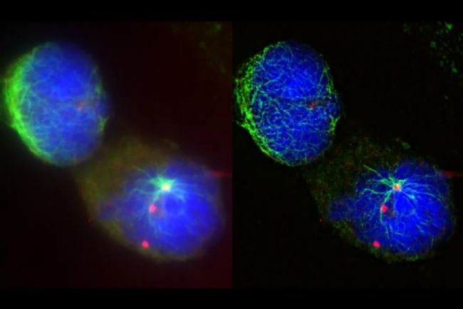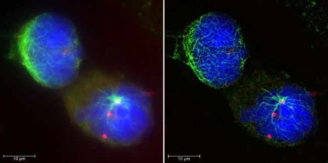 圖1:尤文肉瘤細胞SK-ES-1 α-微管蛋白(綠色)、γ-微管蛋白(紅色)和DNA(藍色)染色后的最大化投影:原始圖像數據(左)和THUNDER LVCC模式成像數據(右)。