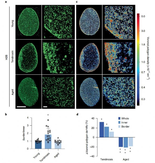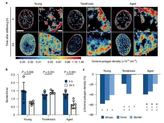 已知組織惡化或衰老會改變致密結締組織的力學環境,因此作者使用超分辨率成像和定量分析來確定衰老和組織惡化是否會導致基因組組織的改變。