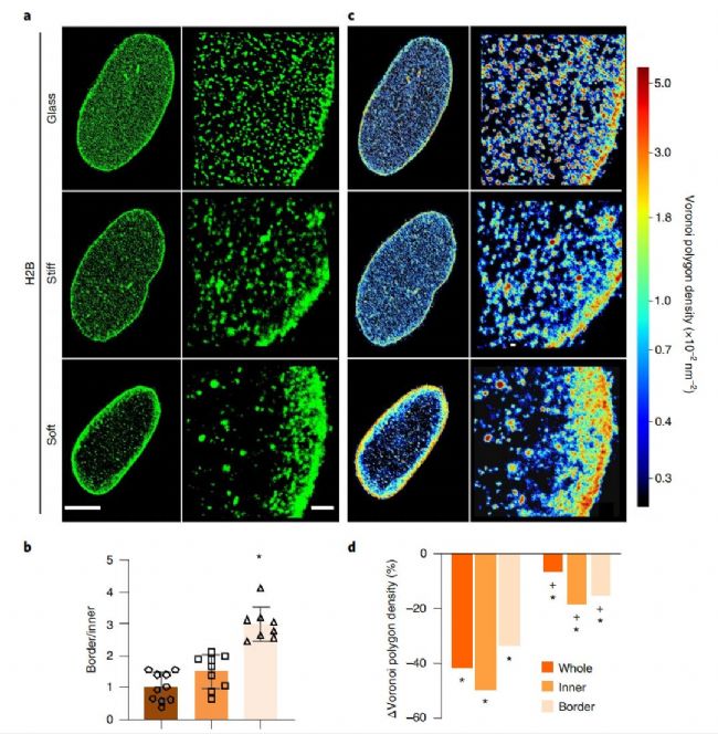圖2.(a)培養在三種不同基質上的hMSCs內組蛋白H2B的STORM圖像。在Stiff和Glass兩組里,H2B在核內分布更為均一,而在Soft組里,H2B則更多分布于核外圍。(b)單位面積內組蛋白H2B在核邊界和核內部區域內的定位數量比例。(c)是(a)中的組蛋白H2B經Voronoi渲染后的數據,紅色是小的Voronoi多邊形,具有較高的組蛋白 H2B密度;藍色是大的Voronoi多邊形,具有較低的組蛋白 H2B密度。(d)三種不同基質上hMSCs細胞核致密染色質室染色質凝縮的變化