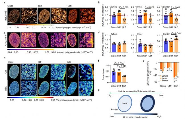 圖3.(a)和(c)分別是H3K4me3和H3K27me3的STORM圖像。(b)和(d)是在不同的基質上培養的hMSCs中,在單位面積內在核邊界和核內部區域內H3K4me3和H3K27me3的定位數量比例。(e)是三種不同基質上培養的經GSK和不經GSK處理的hMSCs細胞核中組蛋白H2B數據,經Voronoi渲染后,紅色是小的Voronoi多邊形,具有較高的組蛋白 H2B密度;藍色是大的Voronoi多邊形,具有較低的組蛋白 H2B密度。(f)使用和不使用GSK處理時,核邊界和核內區域之間H2B定位的變化被量化為核邊界單位面積上H2B定位的數量與核內區域單位面積上H2B定位的總數之比。(g)與對照組hMSCs相比,GSK處理的hMSCs中致密染色質凝縮水平的變化。