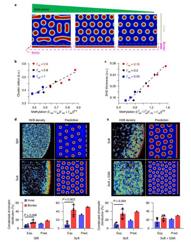 圖4.(a)甲基化的增加對染色質組織的影響,藍色和紅色分別代表常染色質和異染色質富集的區域。(b)異染色質簇的大小與甲基化水平的比例關系。(c)核邊界異染色質結構域(BHDs)厚度與甲基化水平的比例關系。(d)在軟或硬基質上培養的細胞,實驗測量和模型預測的核邊界和核內部異染色質百分比。左邊圖像對應的是前圖中按照Voronoi多邊形大小編碼的H2B顏色的STORM圖像。右邊的圖像與模型預測相對應,藍色為常染色質,紅色為異染色質。(e)在軟基質上培養的經GSK343處理或不經GSK343處理的細胞,實驗測量和模型預測的核邊界和核內部異染色質百分比。左邊圖像對應的是前圖中按照Voronoi多邊形大小編碼的H2B顏色的實驗STORM圖像。右邊的圖像與模型預測相對應,藍色為常染色質,紅色為異染色質。