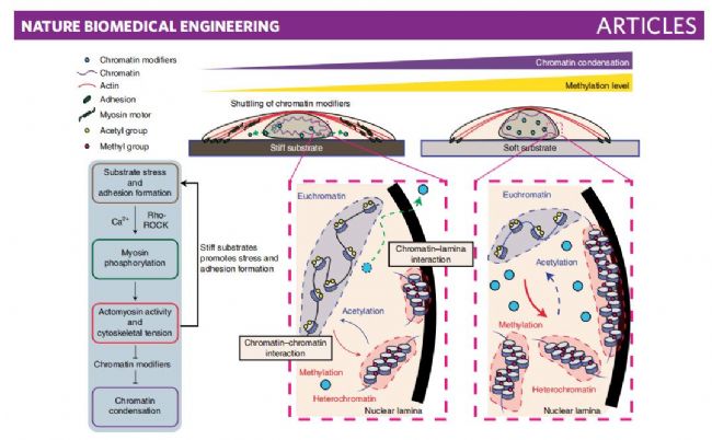 圖8.基質的高硬度改變了以肌動球蛋白為基礎的細胞收縮性,從而促進肌動蛋白應力纖維的形成和局部粘附,并調節染色質修飾物(例如HDAC和EZH2)進出細胞核。這些表觀遺傳修飾物通過調節組蛋白乙酰化/甲基化水平改變染色質在納米尺度上的空間組織和凝縮。