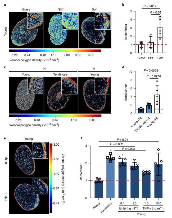 圖6.(a)培養在三種不同基質上的hTCs內組蛋白H2B的STORM圖像。(b)核邊界單位面積上H2B定位總數與核內區域H2B定位總數的比例,顯示在軟基質上培養的hTCs中H2B重新定位到核邊界。(c)組蛋白H2B的STORM圖像,展示在常氧條件下年輕的和肌腱病的hTCs中H2B的定位變化,以及在低氧條件下年輕的hTCs中的H2B定位變化。(d)核邊界單位面積上H2B定位總數與核內區域H2B定位總數的比值,顯示缺氧條件下年輕hTCs中H2B重新定位到核邊界。(e)組蛋白H2B的STORM圖像,展示的是在有/沒有IL-1β和TNF-α的玻璃基質上培養的hTCs中H2B定位的變化。(f)核邊界單位面積上H2B定位總數與核內區域H2B定位總數的比例,顯示hTCs在經炎癥因子處理后H2B的重新定位到核邊界。