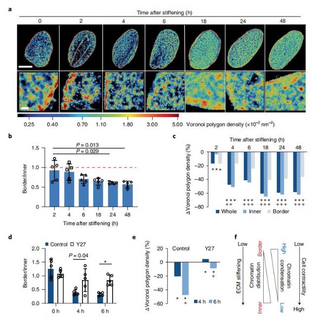 圖5.(a)硬化后0-48h,組蛋白H2B從核外圍到核內部連續重分布的STORM圖像。(b)核邊界H2B定位總數與核內區域H2B定位總數的比值。(c)硬化后0-48h,hMSCs內致密染色質室中染色質凝縮的變化。(d)在加/不加Y27處理硬化后不同時間的水凝膠上培養的hMSCs,單位面積核邊界H2B定位總數與核內部H2B定位總數之比,表明Y27在硬化后阻止了染色質從核邊界到核內部的重新定位。(e)在加/不加Y27的硬化水凝膠上培養的hMSCs中致密染色質室染色質凝縮的變化,Y27處理可防止硬化后致密染色質凝縮隨時間的減少。(f)示意圖顯示ECM硬化如何通過肌動球蛋白為基礎的細胞收縮來調節hMSCs中的染色質分布和凝縮。ECM硬化使染色質從邊界重新分布到hMSC核的內部區域,導致染色質去凝,這需要細胞的收縮。