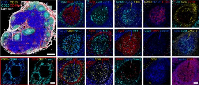 圖二:使用多種抗體的多重免疫熒光技術(shù)(mIF)獲取高內(nèi)容成像數(shù)據(jù):IBEX法獲得的人腸系膜淋巴結(jié)共聚焦圖像。比例尺(500或100µm)。 抗體標(biāo)記靶蛋白分別為β-微管蛋白3(β-Tub3)、Ⅳ型膠原(Coll-IV)、纖維連接蛋白(Fibro)、層粘連蛋白(Lamin),和波形蛋白(Viment)