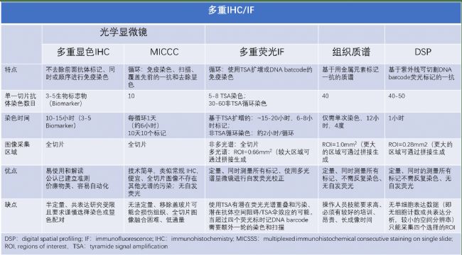 多重技術(shù)可高精度和準(zhǔn)確度展示組織中單個細(xì)胞表達的2-50個標(biāo)記。mIHC可以通過一次向一張切片上添加多個抗體及標(biāo)記(例如VentanaRoche或Biocare Medical)或使用一次一個抗體的染色、剝離、照相循環(huán)方法來進行。mIF技術(shù)有多個平臺,包括可支持4-5重的標(biāo)準(zhǔn)IF分析技術(shù)及可支持6-8重分析的多光譜技術(shù)(Vectra 3.0TM/Polaris)。更高的多重染色方法包括多離子束成像(multiplex ion beam imaging)、飛行時間成像(MIBI-TOF)、成像質(zhì)量流式細(xì)胞術(shù)(imaging mass cytometry-IMC)和數(shù)字空間分析(digital spatial profiling-DSP)等。我們簡要總結(jié)了這些不同方法的基本原則,以及每種方法的優(yōu)缺點(表1、圖1中)。實踐中,每種方法都需要優(yōu)化和驗證。