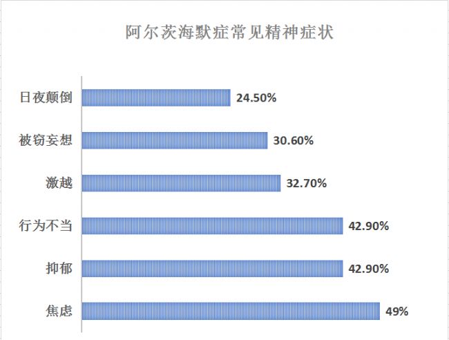阿爾茨海默病除了健忘,還表現出一些精神行為的癥狀,以BEHAVE-AD量表進行BPSD篩查,其早期常見精神行為癥狀依次為:焦慮(49.0%)、抑郁(42.9%)、行為不當(42.9%)、激越(32.7%)、被竊妄想(30.6%)、日夜顛倒(24.5%)。