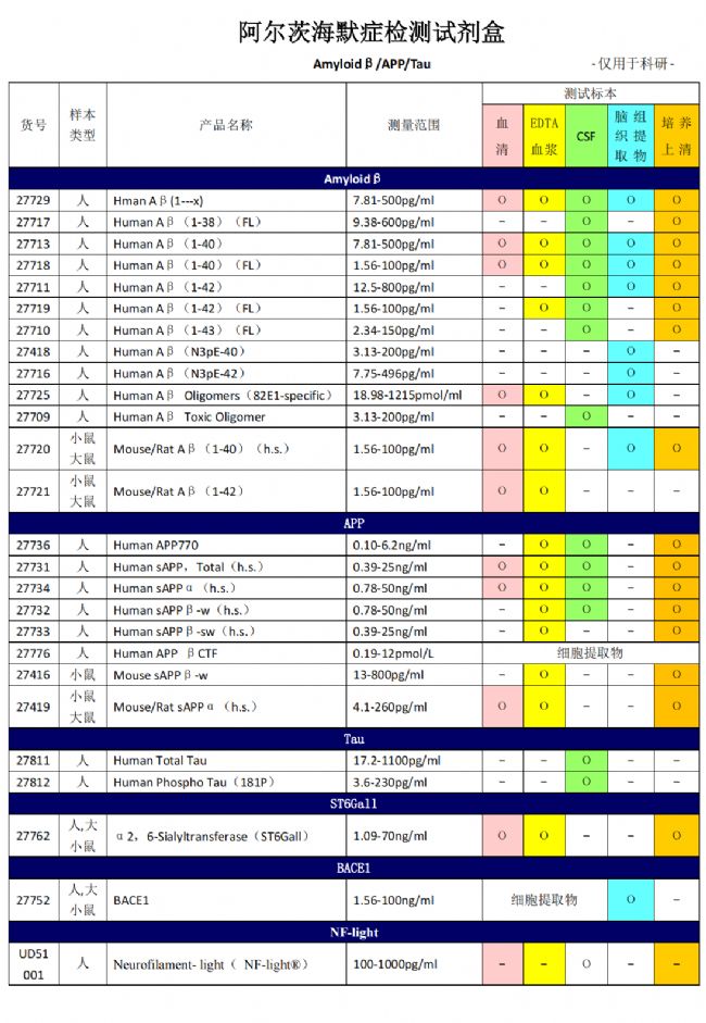 阿爾茲海默癥的試劑盒,并提供科研代測服務。部分產品羅列以下: