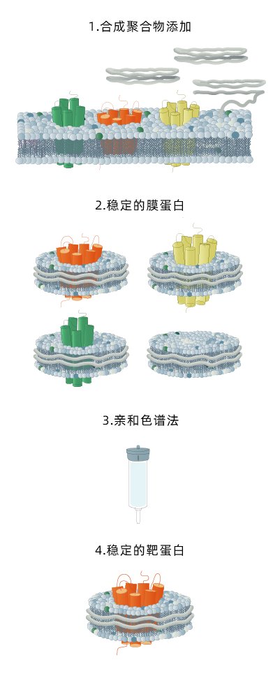 圖2:在包含膜蛋白的天然細胞膜中制備合成納米盤的過程。下一個步驟一般為親和層析。