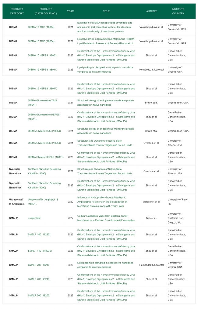 1. Voskoboynikova et al.Evaluation of DIBMA nanoparticles of variable size and anionic lipid content as tools for the structural and functional study of membrane proteins.University of Osnabrück, GER.