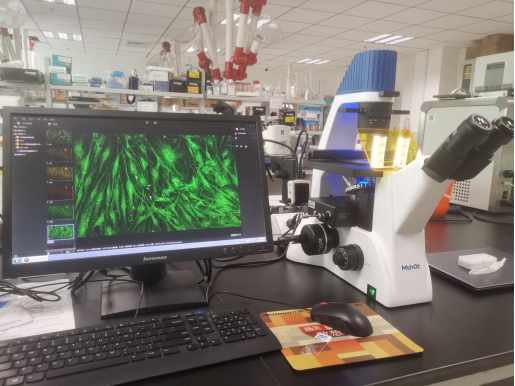 細胞纖維在熒光顯微鏡下呈綠色梭形、大多角形和扁平星形