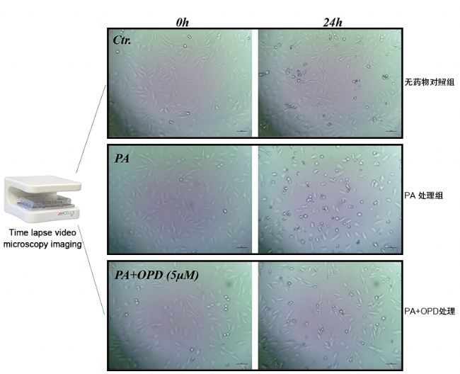 麥冬是一種中草藥,富含甾體皂苷(如OP-D)、異黃酮和多糖等多種生物活性化合物。據報道,OP-D可以調節和緩解炎癥和心血管疾病等癥狀,如改善急性心肌梗死和血管緊張素II誘導的心肌肥厚,減少阿霉素誘導的心肌細胞死亡。為了進一步驗證OP-D的作用機制,本文對H9C2大鼠心肌細胞給予100 μ M棕櫚酸(PA)/PA+OP-D (5 μ M)的無藥對照組進行處理,利用zenCELL owl活細胞動態成像及分析系統(以下簡稱zenCELL owl)在培養箱中實時監測整個變化過程(如圖所示)。圖中0h和24h時間點的監測圖像顯示,PA治療組細胞凋亡數量明顯高于PA+OP-D治療組和無藥對照組。這一結果也與流式細胞術和Western Blotting方法的驗證一致。