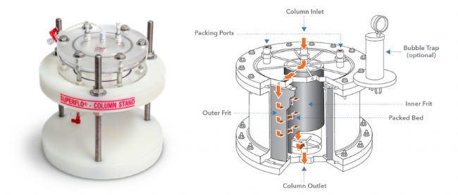 傳統的軸向流層析技術中,其流體在柱內從一端流向另一端,通常是柱上端往下端流動,液流方向沿著中軸重力方向向下流動。