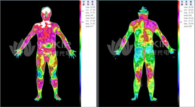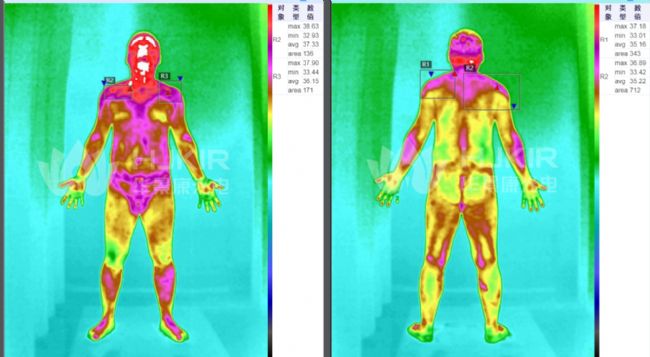 研究患者與正常人的紅外熱圖分析比較發現:患者的脊背熱像圖自頸胸至腰骶均呈高溫差改變,主區為紅色,主要分布在兩側骶棘肌外緣之間,溫度平均高于左右兩側1~2.9℃,可見用紅外熱成像技術在脊柱炎對的診斷上具有顯著的臨床意義。通過對早期強直性脊柱炎的患者紅外熱成像研究表明:早期患者在骶髂關節區均有明顯高溫差改變,同時發現溫度增高程度與血沉增快程度呈正比,血沉越快溫差越大,可以通過治療前后的溫差比較顯示出病情的輕重。說明醫用紅外熱成像技術對早期患者的診斷及療效評估均有一定的臨床意義。