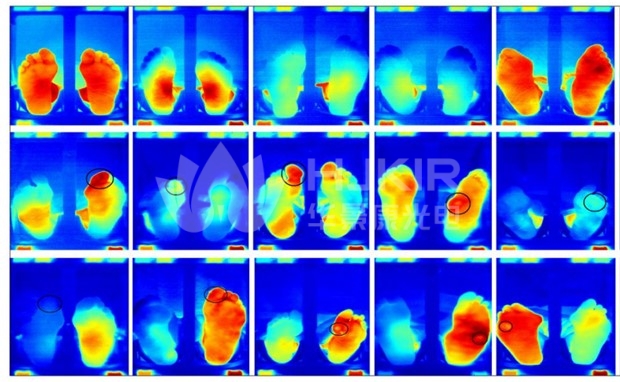 醫用紅外熱像儀KIR-2008B不僅是診斷糖尿病血管病變早期診斷的適用工具,還可以在患病初期使用有助于確定糖尿病足患者的小纖維神經病變,以及識別糖尿病足已發病或處于潛伏期的階段,以雙足大拇指第1跖頭、第5跖頭、足跟、趾髓處溫度較低為主,還可以檢測出糖尿病足疾病的征兆,并可以區分局部或彌漫性糖尿病足并發癥。