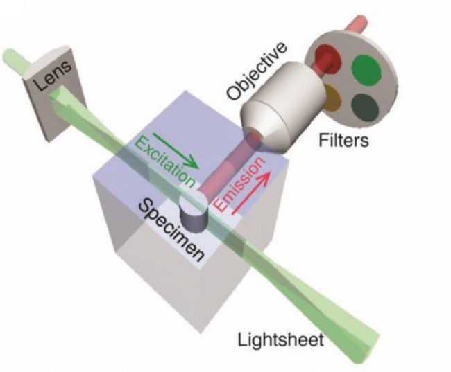 光片熒光顯微鏡,是一種新型的三維顯微成像技術,采用正交光路設計,用一層薄光片從側面激發樣品,并且在垂直于光片的方向上利用顯微物鏡和數字相機拍攝樣品的二維熒光圖像,通過軸向掃描光片或移動樣品逐面成像,獲取不同深度處的層析圖像最終實現樣品的三維重構。