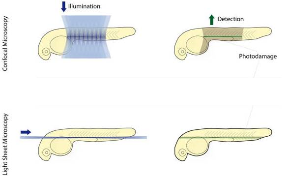 光片顯微鏡與傳統的熒光照明技術相比,光照是從樣品的側面發出,只會照亮平面上的樣品組織,這樣光毒性可以被降低很多倍,可以在更接近生理狀態的條件下,對活體生物樣品進行長時間的三維成像。