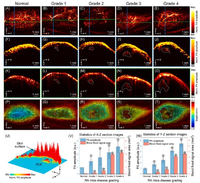 圖2成像結果顯示,與正常小鼠相比,RA小鼠膝關節的光聲信號強度和信號面積隨著疾病評價等級的增加而增加,RA小鼠模型滑膜、半月板和軟骨下骨的新生血管逐漸增多。特別是在圖(U)中,構建了發病等級為4的小鼠膝關節的3D圖像,在皮膚信號下方可以清晰看到膝關節內明顯的血管混濁特征。