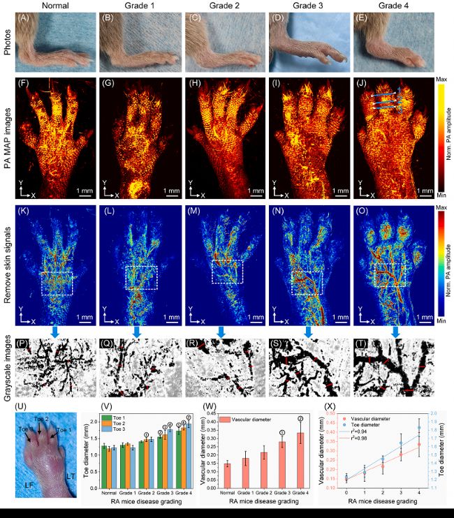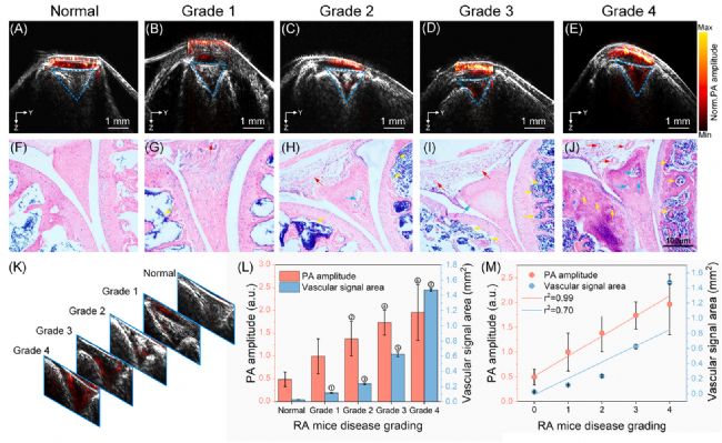 汕頭大學第一附屬醫院胡軍教授與他的團隊使用了光聲/超聲雙模態成像的方式對RA的關節炎中血管翳生成以及滑膜侵蝕方面進行了探索,實驗通過使用不同患病程度的小鼠模型,使用ANI的光聲成像對小鼠后爪皮下血管進行監測。通過光聲成像結果(圖1)來看,可以明顯看出成像血管翳增生的面積和光聲信號強度均與RA疾病分級呈正相關性。