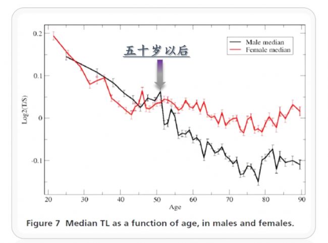一項(xiàng)著名的端粒長(zhǎng)度研究表明,五十歲以后,男性的端粒長(zhǎng)度下降的更快;七十歲以后,端粒短者不斷逝去,剩余老年人多為端粒較長(zhǎng)者。