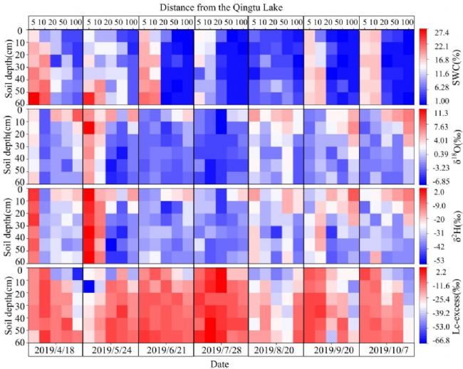 土壤剖面中SWC、δ2H、δ18O和Lc-excess的時空動態(tài)。
