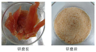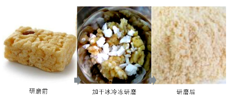 粘性樣品如薩其馬、磨效果。而用干冰對樣品低溫脆化處理后,即可研磨成均勻的粉末。