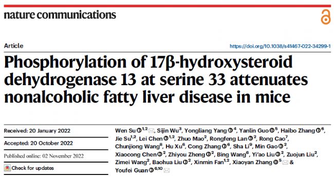 2022年11月,深圳大學蘇文研究員、華東師范大學張曉燕教授與大連醫科大學管又飛教授團隊,在Nature Communications上發表題為“Phosphorylation of 17β-hydroxysteroid dehydrogenase 13 at serine 33 attenuates nonalcoholic fatty liver disease in mice”的文章,揭示了17β-HSD13的蛋白磷酸化對肝細胞脂滴代謝的重要調控機制,并提出了一種新的靶向治療NAFLD方案。已有研究證明新型肝脂滴蛋白17β-HSD13(屬于17β類固醇脫氫酶),特異性表達于肝臟脂滴表面,其過表達可顯著促進脂肪肝的發生和發展,提示17β-HSD13可能在脂肪肝的干預治療中具有重要價值,但其確切功能及相關調控機制仍不清楚。本文研究中該聯合團隊發現,在肝細胞內17β-HSD13和肝臟重要水解酶——脂肪甘油三酯脂肪酶(Adipose triglyceride lipase,ATGL)及其輔因子CGI-58(Comparative gene identification 58)三者間存在動態的結合,PKA信號通路的激活可以使17β-HSD13的絲氨酸33位磷酸化,從而增加CGI-58對ATGL的激活,進而促進脂滴中甘油三酯的水解和線粒體的β-氧化,從而改善肝細胞內甘油三酯的積累。